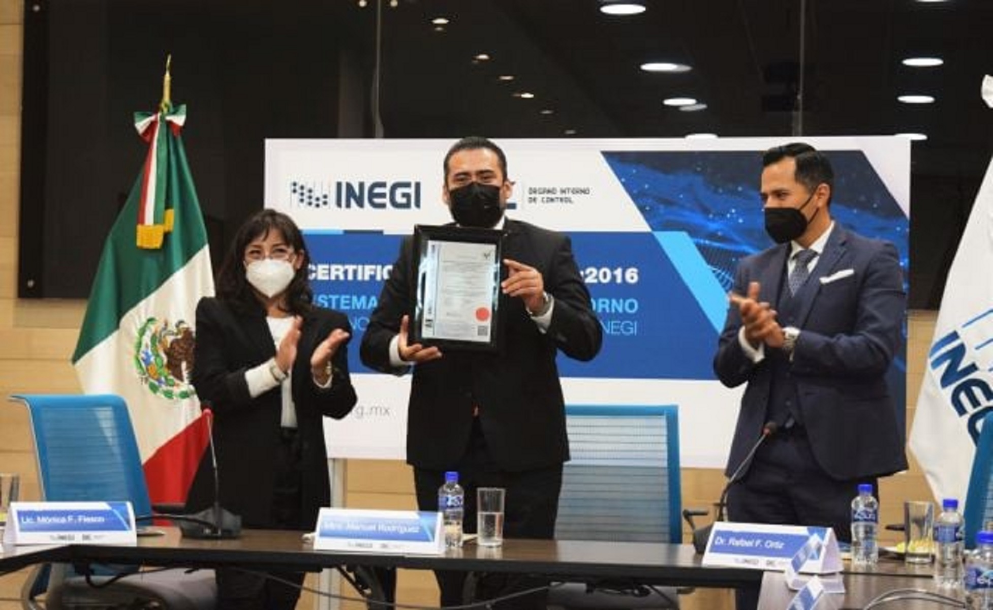 El titular del Órgano Interno de Control (OIC) del Instituto Nacional de Estadística y Geografía (INEGI), Manuel Rodríguez Murillo, recibió el Certificado ISO 37001:2016 “Sistemas de Gestión Antisoborno”, de manos de Mónica Fiesco, representante en México del organismo de certificación internacional SIS Certifications.