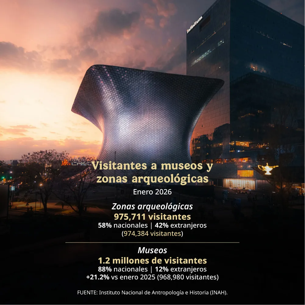 La titular de la Secretaría de Turismo señaló que, de acuerdo con cifras del Instituto Nacional de Antropología e Historia (INAH), en enero de 2026 los museos del país registraron 1.2 millones de visitantes (88 por ciento nacionales y 12 por ciento extranjeros), cifra que representa un crecimiento de 21.2 por ciento frente a enero de 2025 y de 13.1 por ciento en comparación con el mismo mes de 2019, previo a la pandemia.